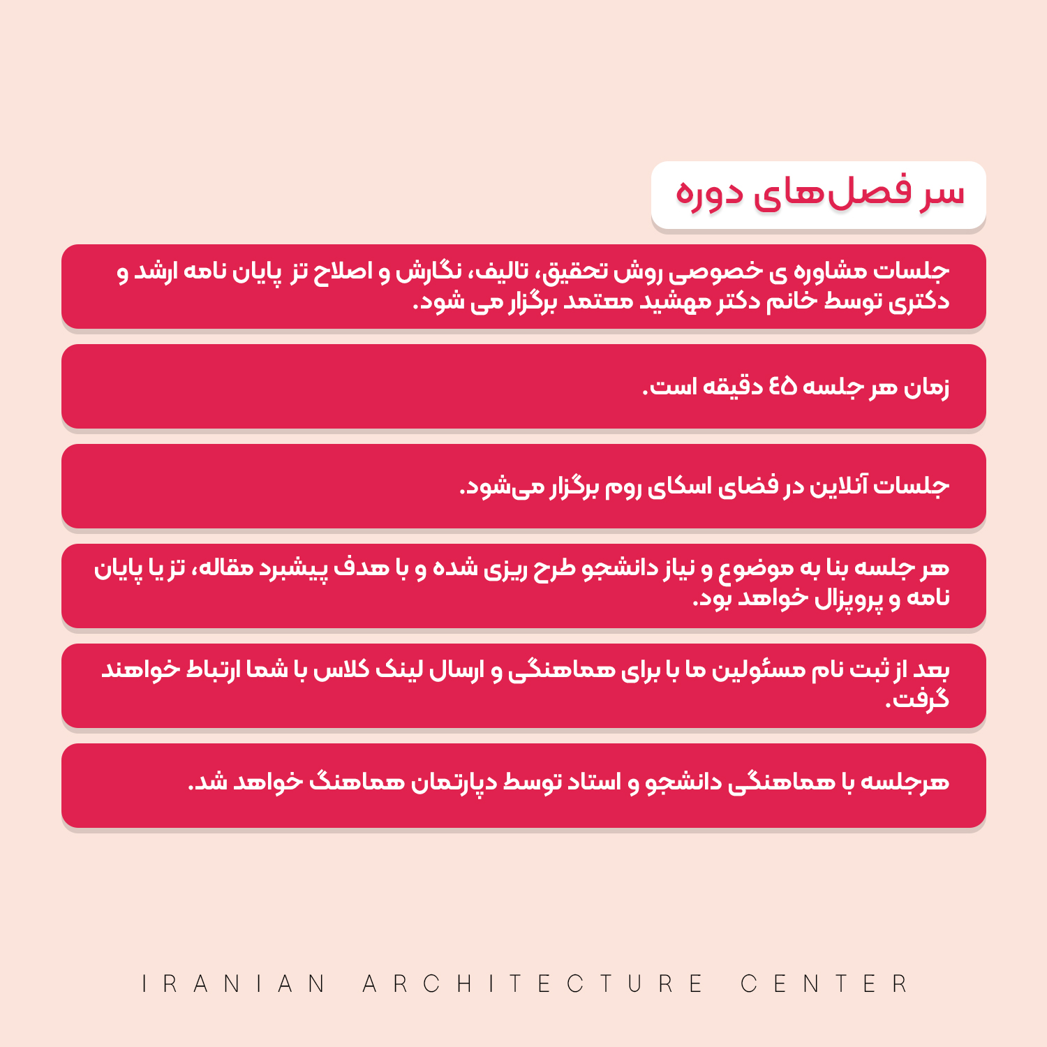 4. هر جلسه بنا به موضوع و نیاز دانشجو طرح ریزی شده و با هدف پیشبرد مقاله، تز یا پایان نامه و پروپزال خواهد‌ بود.